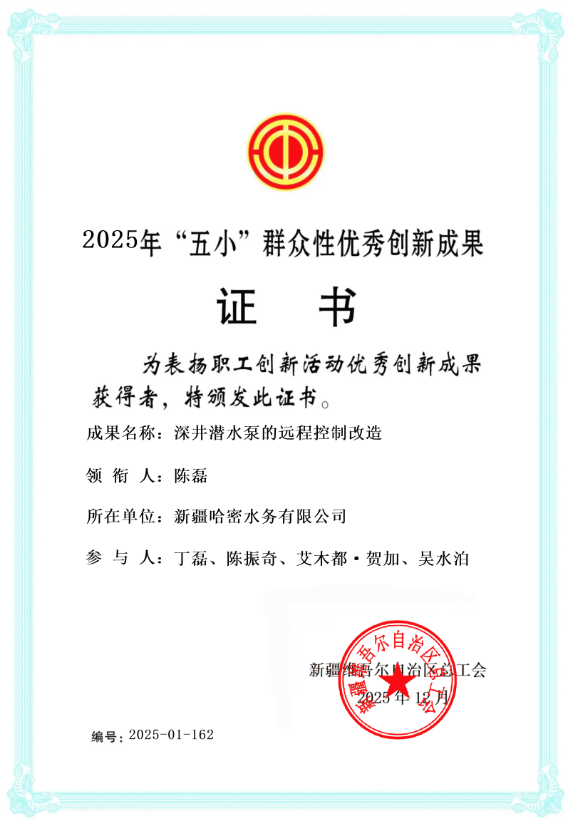 近日,新疆維吾爾自治區(qū)總工會發(fā)布《關(guān)于公布2025年自治區(qū)職工創(chuàng)新活動優(yōu)秀創(chuàng)新成果獎勵名單的通知》,由中國水務(wù)所屬昌源集團哈密水務(wù)生產(chǎn)技術(shù)部團隊完成的“深井潛水泵的遠程控制改造”項目,獲評新疆維吾爾自治區(qū)2025年度“五小”群眾性優(yōu)秀創(chuàng)新成果。