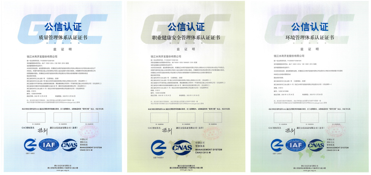 近日,經(jīng)過浙江公信認(rèn)證有限公司評審專家組的嚴(yán)格審核,錢江水利開發(fā)股份有限公司順利通過了質(zhì)量管理體系、環(huán)境管理體系和職業(yè)健康安全管理體系認(rèn)證的外部審核,取得“三系”認(rèn)證證書,公司管理體系建設(shè)及資質(zhì)提升工作取得階段性成果。