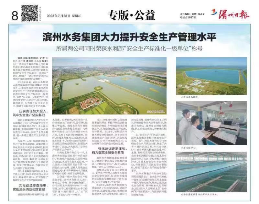 近日,濱州日報、魯北晚報、濱州網(wǎng)相繼報道了山東水務(wù)所屬濱州水務(wù)集團(tuán)北海水務(wù)公司和南海水務(wù)公司榮獲水利部“安全生產(chǎn)標(biāo)準(zhǔn)化一級單位”稱號相關(guān)信息,引起了社會各界的廣泛關(guān)注和贊譽(yù)。濱州水務(wù)集團(tuán)兩家所屬公司榮獲該項稱號,打響了一家水管企業(yè)同時獲得兩個部級榮譽(yù)的“雙響炮”。