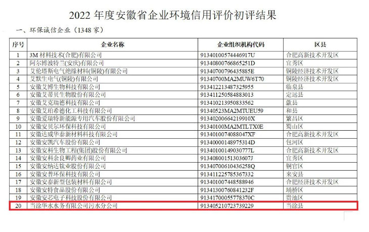近日,安徽省生態(tài)環(huán)境廳對2022年度錄入評價系統(tǒng)的2970家重點污染源單位進行了評價,江蘇水務下屬當涂公司榮獲2022年度安徽省“年度環(huán)保誠信企業(yè)”稱號。