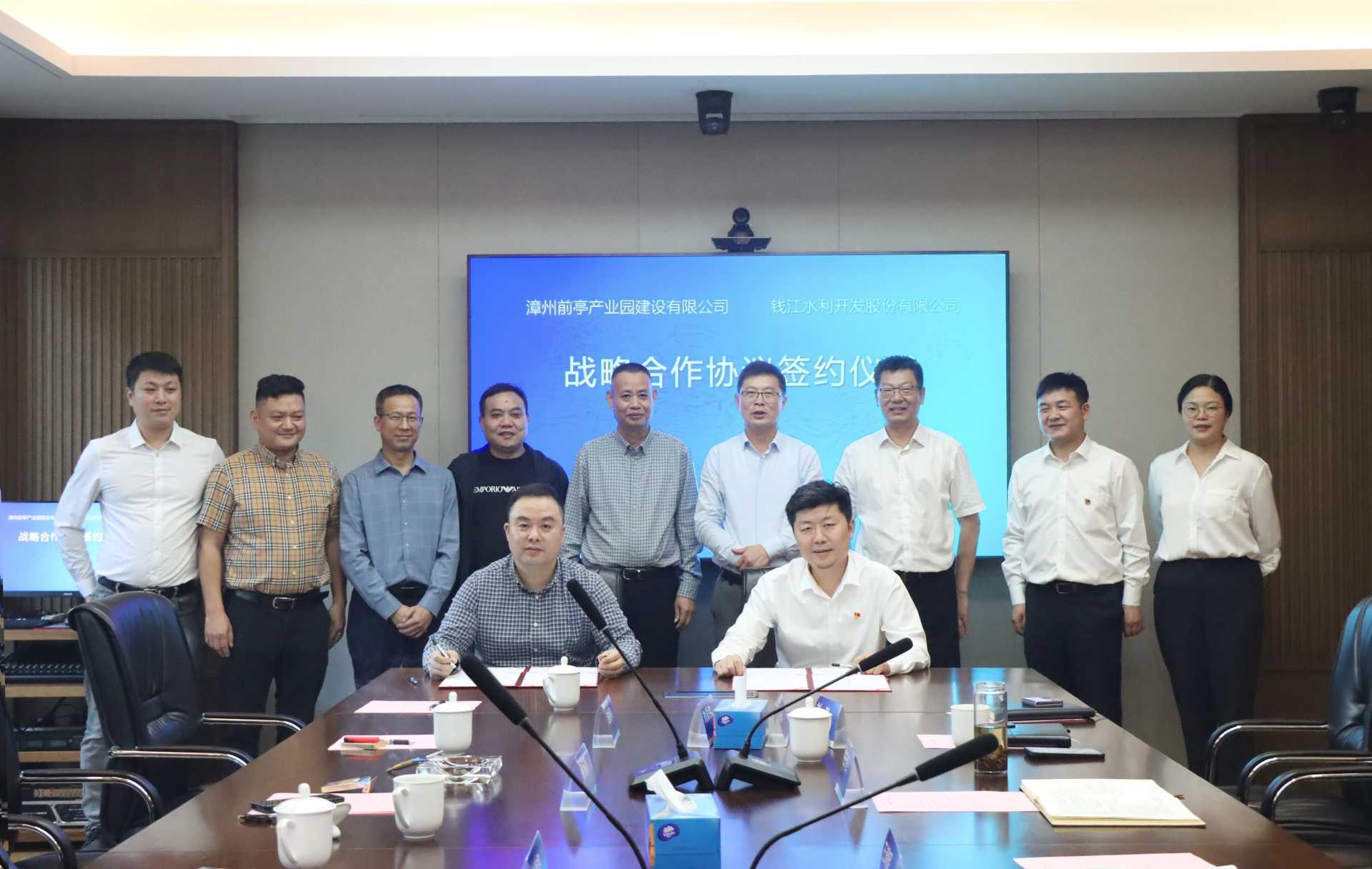 10月23日,錢江水利開發(fā)股份有限公司與漳州前亭產(chǎn)業(yè)園建設(shè)有限公司戰(zhàn)略合作框架協(xié)議簽約儀式在杭州舉行,雙方就漳浦前亭工業(yè)園水務(wù)環(huán)?;A(chǔ)設(shè)施建設(shè)共建簽訂戰(zhàn)略合作協(xié)議。漳州前亭產(chǎn)業(yè)園建設(shè)有限公司領(lǐng)導(dǎo)黃楊明、宋鎮(zhèn)超,錢江水利黨委書記、總經(jīng)理王天強(qiáng),副董事長王朝暉,黨委委員、副總經(jīng)理劉堃出席簽約儀式。