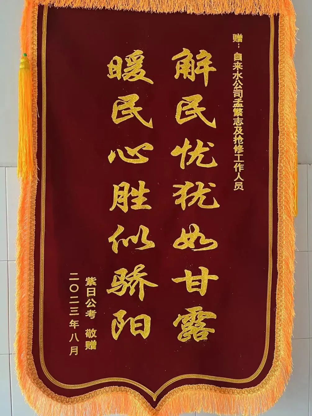 為向水務(wù)集團(tuán)的熱情服務(wù)表示由衷的感謝,紫日公考學(xué)校的負(fù)責(zé)人將定制的一幅印有“解民憂猶如甘露、暖民心勝似驕陽(yáng)”字樣的錦旗,送到了齊齊哈爾水務(wù)集團(tuán)客服中心。