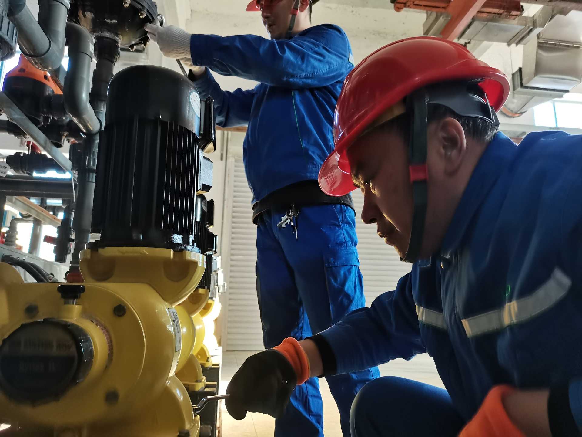 泵房?jī)?nèi),機(jī)聲隆隆。設(shè)備維修工梁洪濤和兩名同事正在巡檢各個(gè)壓泵、水泵,進(jìn)行維護(hù)保養(yǎng),確保水廠重點(diǎn)設(shè)施和關(guān)鍵設(shè)備平穩(wěn)運(yùn)行。水廠值班全年均為24小時(shí)不間斷,并不區(qū)分工作日和節(jié)假日。記者在體驗(yàn)巡檢工作時(shí)看到,所有工作人員都以飽滿的精神狀態(tài),堅(jiān)守在各自崗位上。
