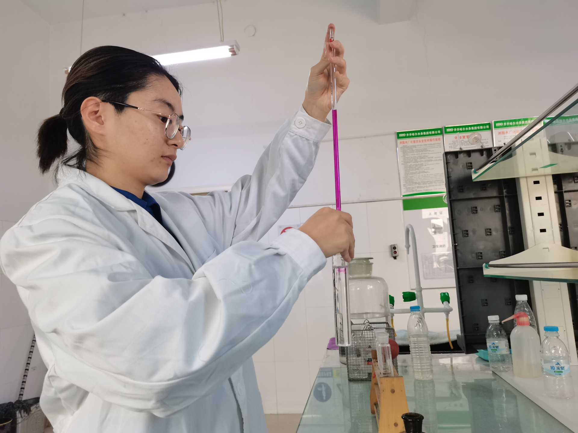 在瀏園中心水廠原水入水口,汩汩嫩江水翻涌而上流進(jìn)原水池,化驗(yàn)員陳雨瑩將取水器拋入水池,這是她每天原水檢驗(yàn)工作的第一項(xiàng)——取水?!罢G闆r,原水檢測(cè)一天一次,從現(xiàn)在開始都提高了檢測(cè)頻率,原水一天兩次,白天一次,晚上一次。過程水兩個(gè)小時(shí)取一次,出廠水是實(shí)時(shí)監(jiān)測(cè)檢測(cè)?!标愑戡搶⑺畼訋Щ貦z測(cè)室,倒入相應(yīng)的容器內(nèi),添加對(duì)應(yīng)試劑,濁度、PH值(酸堿度)等都是基本檢測(cè)項(xiàng)目。