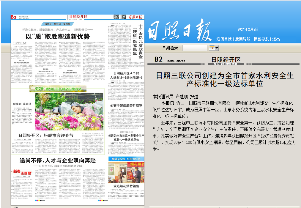 2月2日,《日照日報》報道山東水務(wù)所屬日照三聯(lián)公司順利通過水利部安全生產(chǎn)標(biāo)準(zhǔn)化一級單位達標(biāo)評審,成為日照市第一家、山東水務(wù)系統(tǒng)內(nèi)第三家水利安全生產(chǎn)標(biāo)準(zhǔn)化一級達標(biāo)單位。