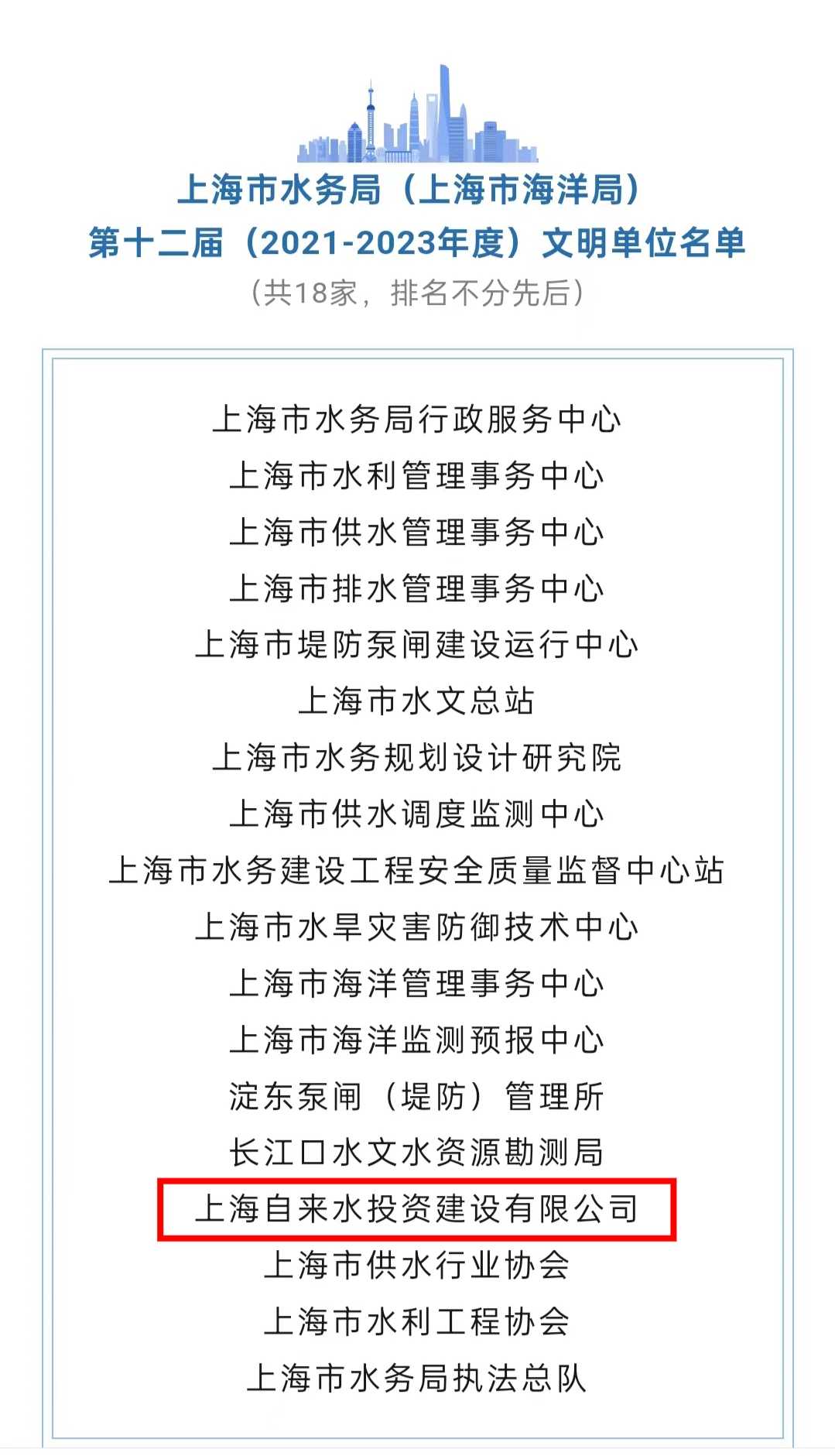 經(jīng)上海市水務(wù)局(上海市海洋局)綜合考評,上海自來水投資建設(shè)有限公司被命名為:第十二屆(2021-2023年度)上海市水務(wù)局(上海市海洋局)文明單位。
