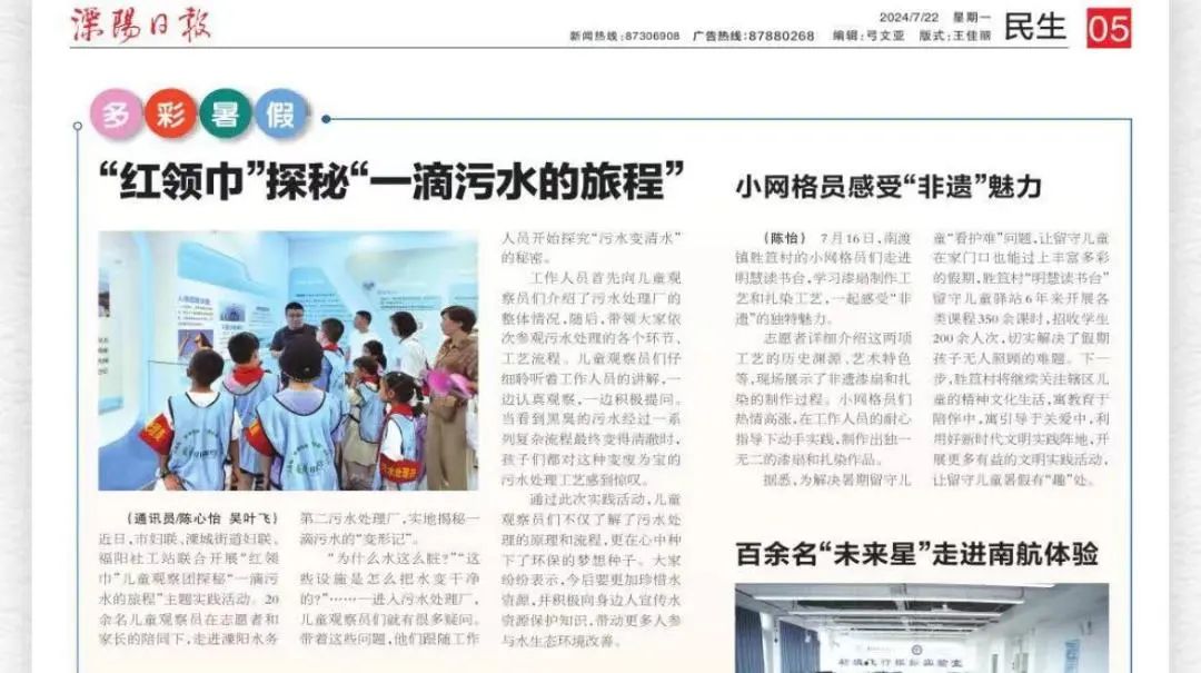 近日,《溧陽日報》報道了在華東區(qū)域總部溧陽水務(wù)第二污水處理廠節(jié)水科普基地開展的實踐活動。該節(jié)水科普基地是溧陽水務(wù)搭建的面向社會開放的、傳播節(jié)水知識、推廣節(jié)水措施、提升節(jié)水意識的公益平臺,接待前來參觀學(xué)習(xí)的社會各界人士超2500人次。