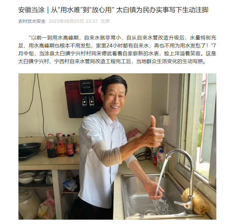 近日,中國(guó)農(nóng)業(yè)節(jié)水和農(nóng)村供水技術(shù)協(xié)會(huì)分會(huì)官方公眾號(hào)“農(nóng)村飲水安全”及當(dāng)涂縣電視臺(tái)對(duì)華東區(qū)域總部下屬當(dāng)涂華水水務(wù)承建的當(dāng)涂縣農(nóng)村飲用水改造提升工程(EPCO)項(xiàng)目的顯著成效及其惠企成果進(jìn)行專題報(bào)道。作為當(dāng)涂縣重點(diǎn)基礎(chǔ)設(shè)施工程,該項(xiàng)目不僅顯著提升了農(nóng)村供水水質(zhì)和穩(wěn)定性,更通過(guò)優(yōu)化供水網(wǎng)絡(luò),有效改善了區(qū)域營(yíng)商環(huán)境,為城鄉(xiāng)融合發(fā)展提供了堅(jiān)實(shí)支撐。