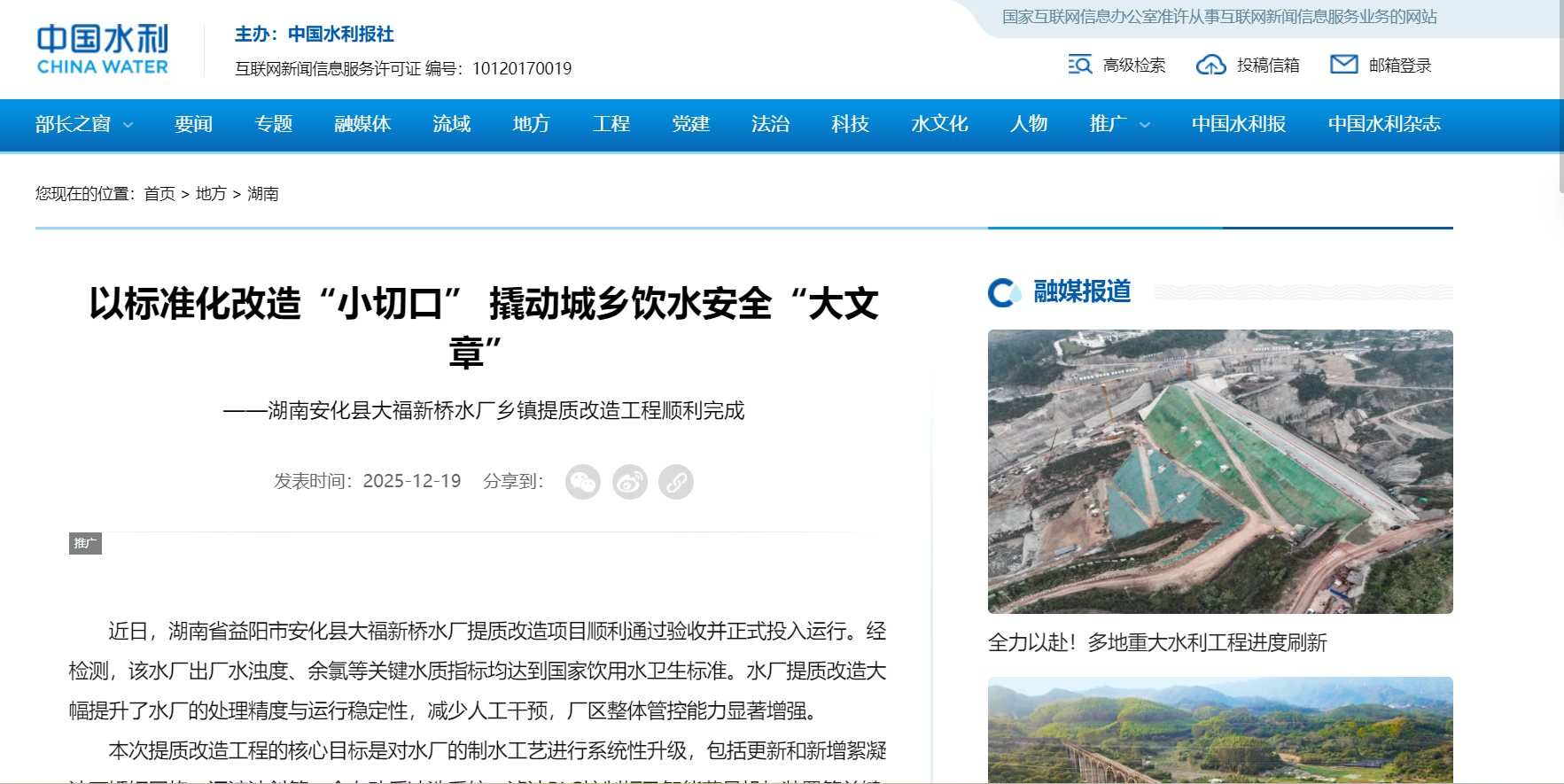 12月19日,《中國水利》報道中國水務(wù)華中區(qū)域總部所屬安化公司推動安化縣大福新橋水廠提質(zhì)改造項目順利通過驗收并正式投入使用,標志著該縣在推進城鄉(xiāng)供水一體化、提升飲水安全保障水平方面邁出堅實一步。此次改造以標準化、智能化為核心,通過優(yōu)化制水工藝、提升自動化水平,有效保障了供水水質(zhì)與運行穩(wěn)定性,為全縣同類水廠的升級提供了可復(fù)制的實踐樣本。