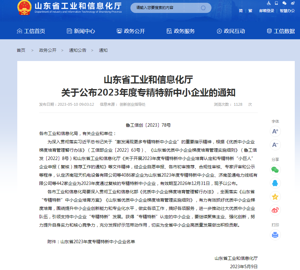 5月10日,山東省工業(yè)和信息化廳正式公布2023年度山東省專精特新中小企業(yè)名單,壽光環(huán)??萍加邢薰荆ㄒ韵潞喎Q“壽光環(huán)保”)首次被認定為山東省2023年度專精特新中小企業(yè)。