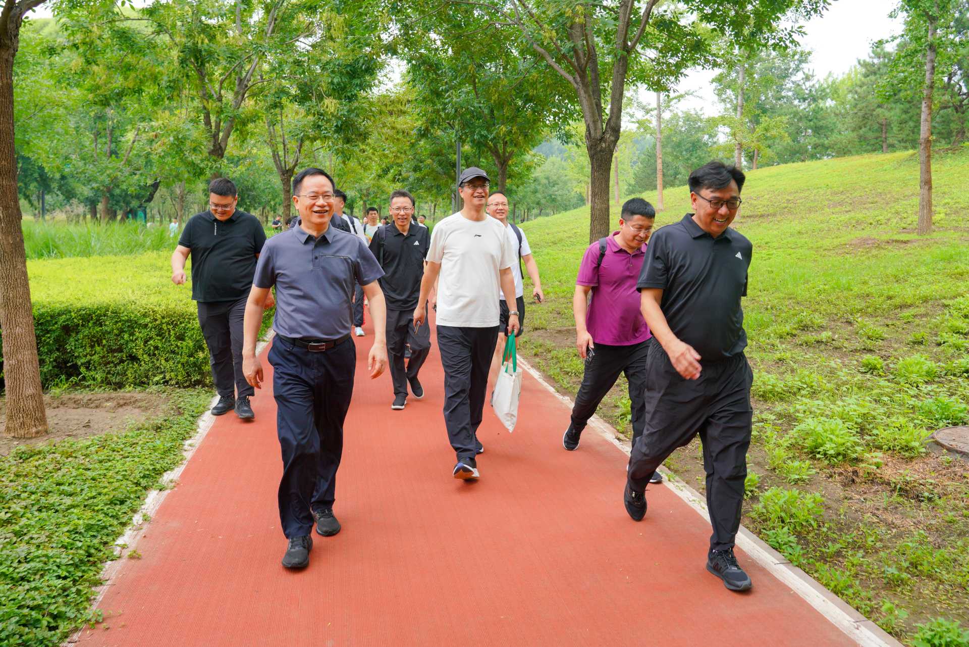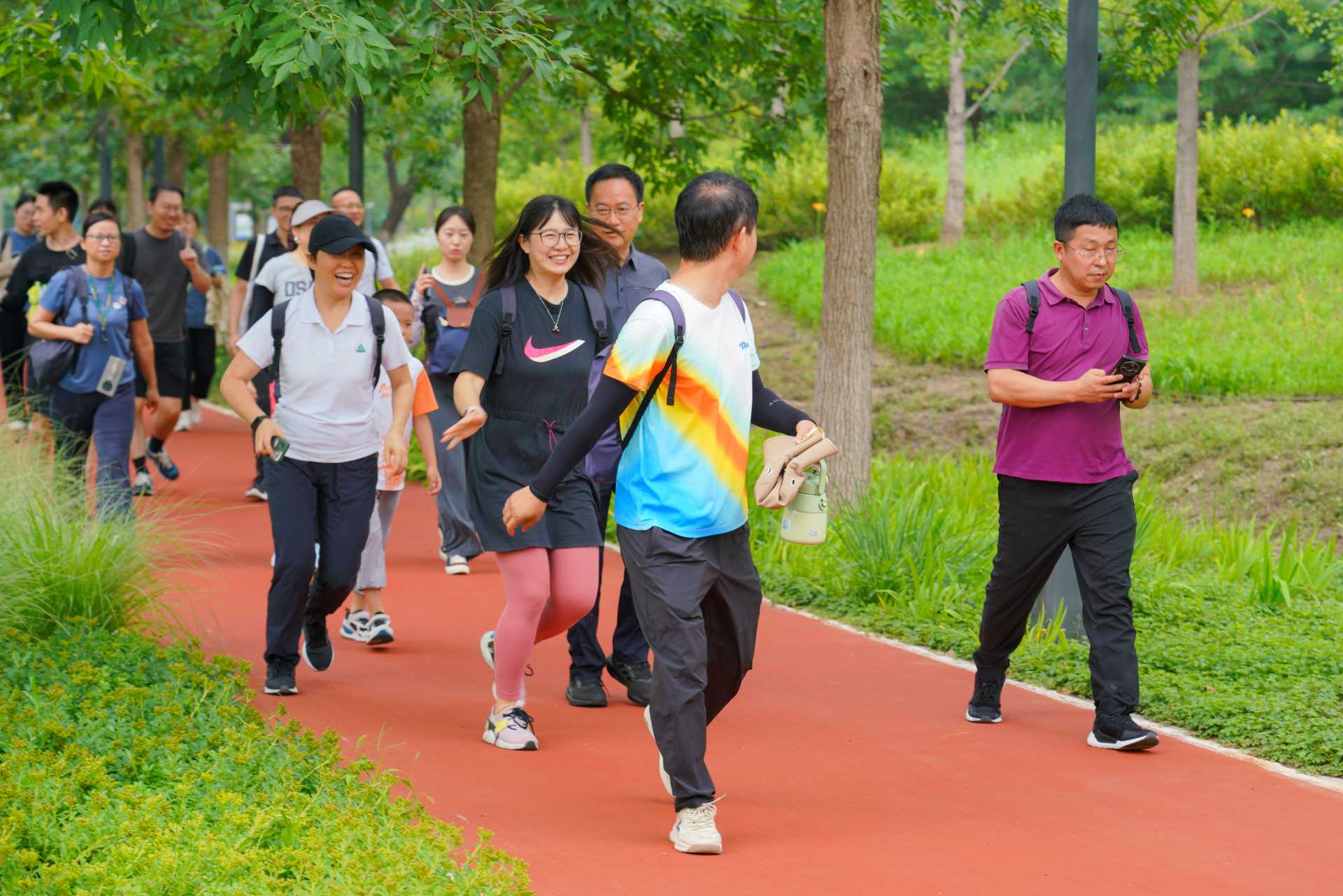 本次健步走活動總路程約5.5公里。大家沿著城市綠心森林公園健身步道闊步前行,個個精神抖擻、意氣風發(fā)。整個路程形似一顆五角星,一路上大家盡情呼吸著清新空氣,享受城市綠色風光的愜意。有的同事結(jié)伴而行悠然漫步,有的同事拿起手機定格美景,有的同事與孩子嬉戲玩耍歡樂不斷,有的同事步伐輕盈一馬當先?;顒蝇F(xiàn)場氣氛熱烈,大家明媚的笑容成為公園里一道靚麗的風景線。