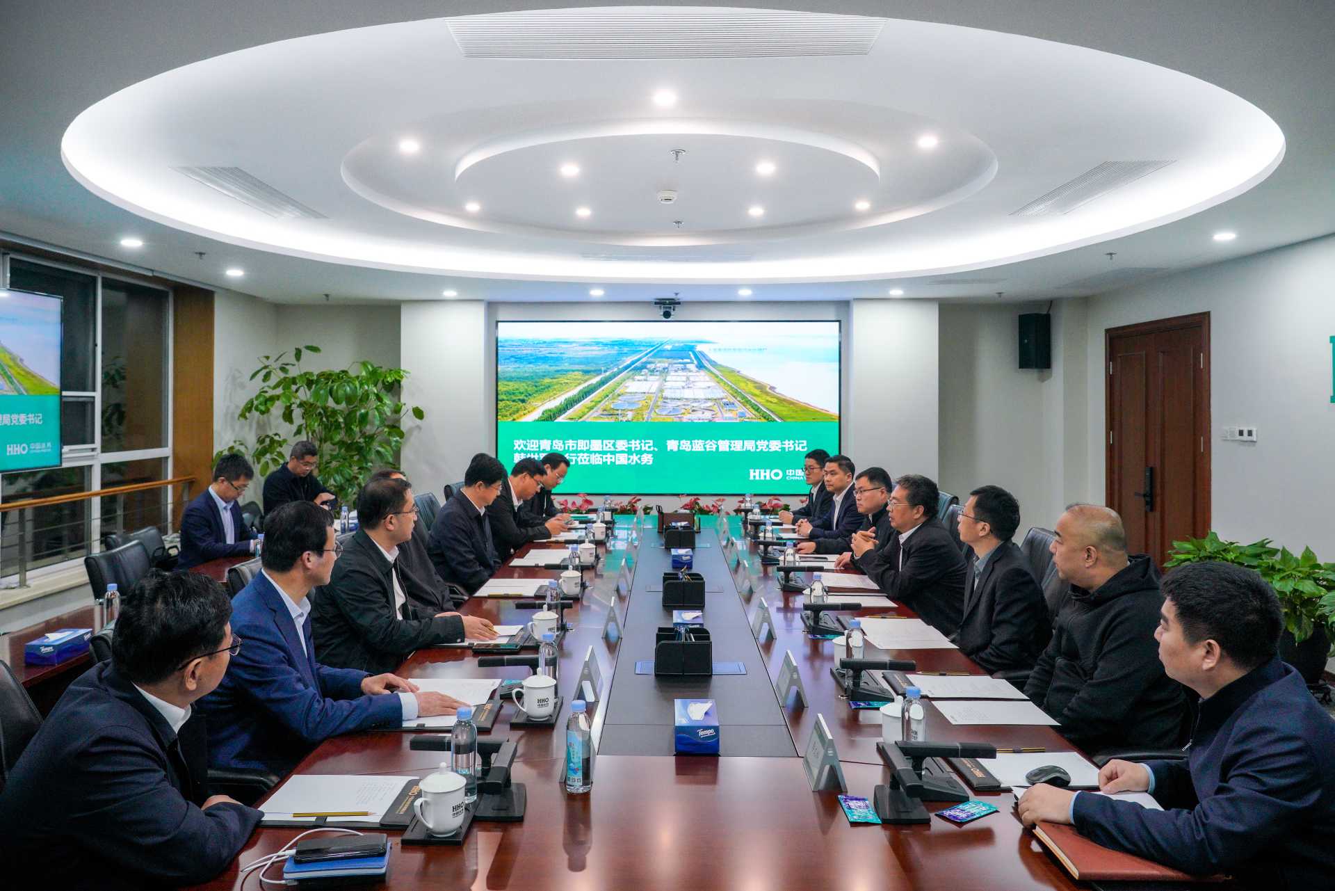 王明海對韓世軍一行的到來表示熱烈歡迎,簡要介紹了中國電建、中國水務(wù)總體情況。他表示,中國水務(wù)具有中國電建和水利部兩大核心股東,能夠發(fā)揮“投建營”一體化能力和全產(chǎn)業(yè)鏈一體化優(yōu)勢,為地方政府提供整體解決方案。經(jīng)過多年在水務(wù)市場深耕細(xì)作,中國水務(wù)在城鄉(xiāng)水務(wù)一體化、供排水一體化等方面積累了豐富的技術(shù)和運(yùn)營經(jīng)驗(yàn)。中國水務(wù)愿意發(fā)揮自身優(yōu)勢深入?yún)⑴c即墨區(qū)水務(wù)一體化工作,做好即墨區(qū)“水”文章。