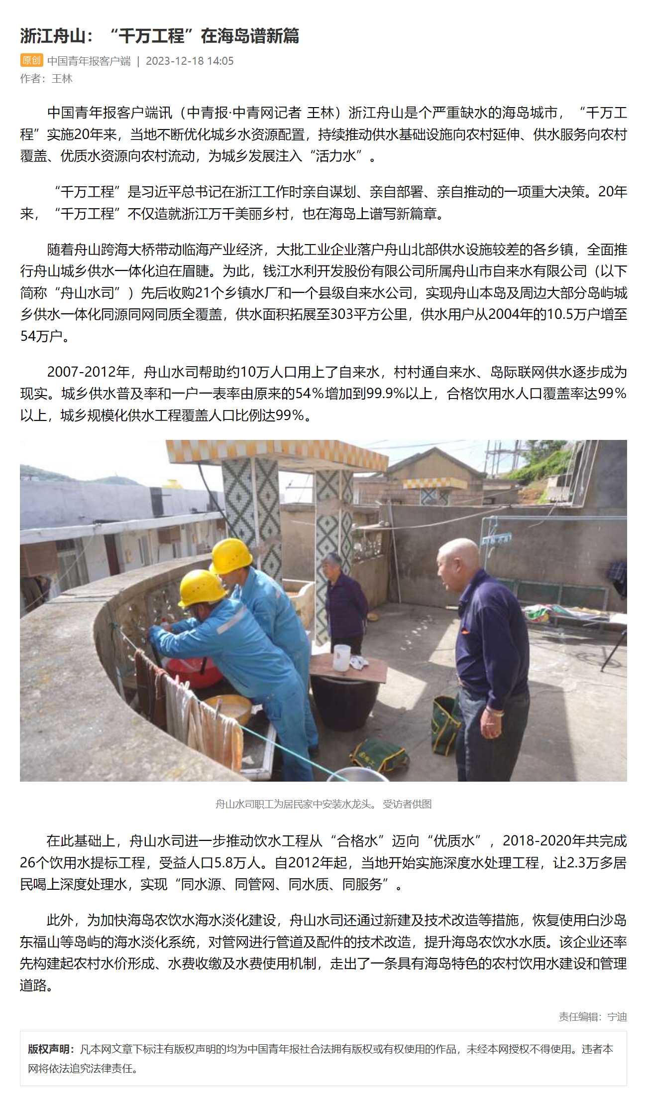 12月18日,《中國青年報﹒中青網(wǎng)》報道中國水務(wù)所屬舟山市自來水有限公司立足海島農(nóng)民群眾供水,20年來積極踐行“八八戰(zhàn)略”和“千萬工程”的經(jīng)驗案例。浙江 “千萬工程”實施20年來,舟山水司提高政治站位,發(fā)揮屬地優(yōu)勢,帶領(lǐng)全體干部職工不斷優(yōu)化城鄉(xiāng)水資源配置,持續(xù)推動供水基礎(chǔ)設(shè)施向農(nóng)村延伸、供水服務(wù)向農(nóng)村覆蓋、優(yōu)質(zhì)水資源向農(nóng)村流動,為海島區(qū)域城鄉(xiāng)一體化發(fā)展注入“活力水”。