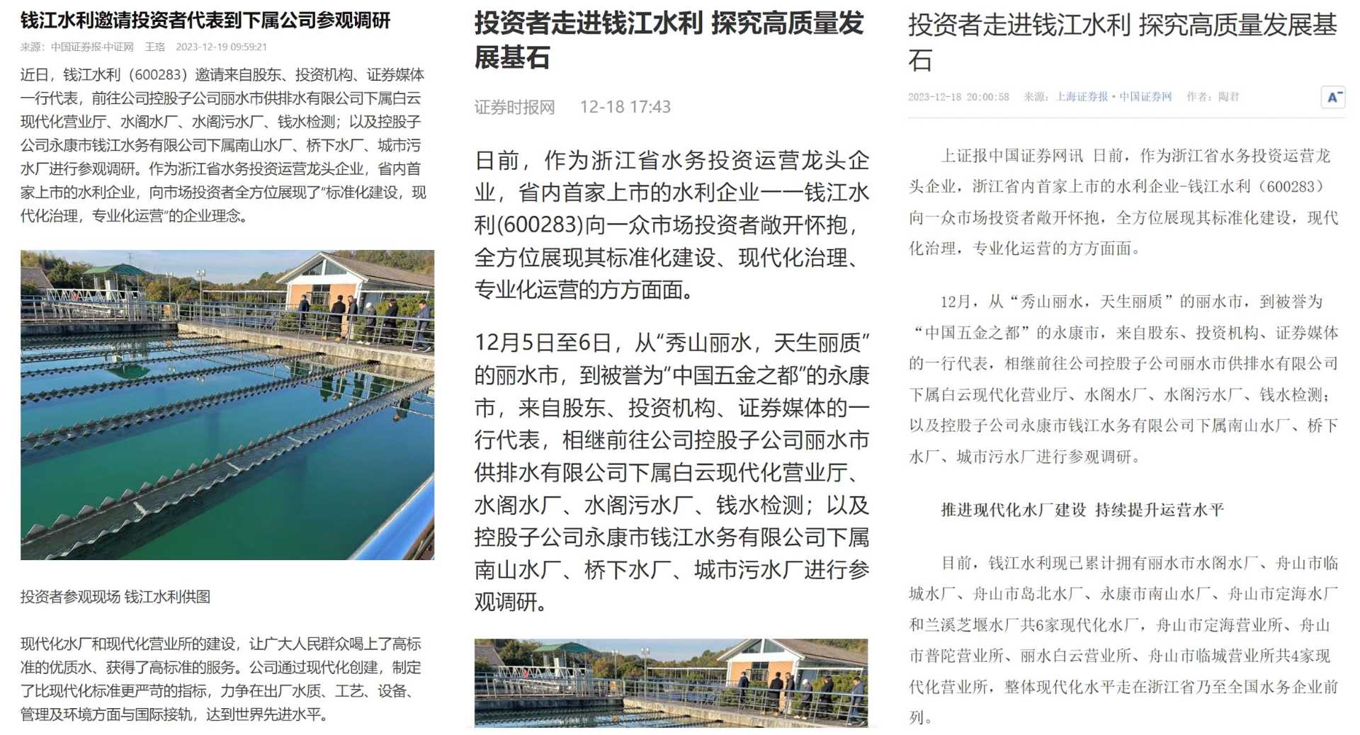 近日,中國水務所屬上市公司錢江水利向一眾市場投資者敞開懷抱,全方位展現上市公司“標準化建設,現代化治理,專業(yè)化運營”的企業(yè)理念,為投資者呈現真實、透明的上市公司,搭建傳遞、發(fā)現價值橋梁一事,中國證券報·中證網、證券時報、上海證券報等多家媒體采訪報道。