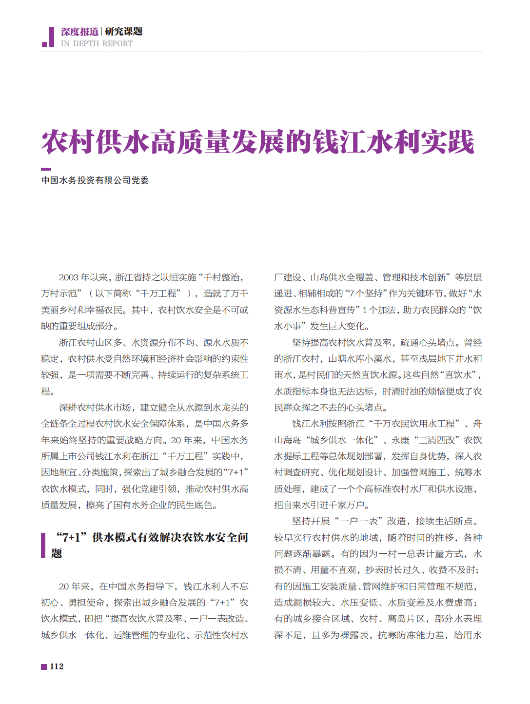 近日,由國(guó)務(wù)院國(guó)資委主管,國(guó)資委新聞中心和中國(guó)經(jīng)濟(jì)出版社聯(lián)合主辦《國(guó)資報(bào)告》雜志刊發(fā)中國(guó)水務(wù)文章——《農(nóng)村供水高質(zhì)量發(fā)展的錢江水利實(shí)踐》。中國(guó)水務(wù)在浙江“千萬(wàn)工程”實(shí)踐中,因地制宜、分類施策,探索出了城鄉(xiāng)融合發(fā)展的“7+1”農(nóng)飲水模式,同時(shí),強(qiáng)化黨建引領(lǐng),推動(dòng)農(nóng)村供水高質(zhì)量發(fā)展,擦亮了國(guó)有水務(wù)企業(yè)的民生底色。