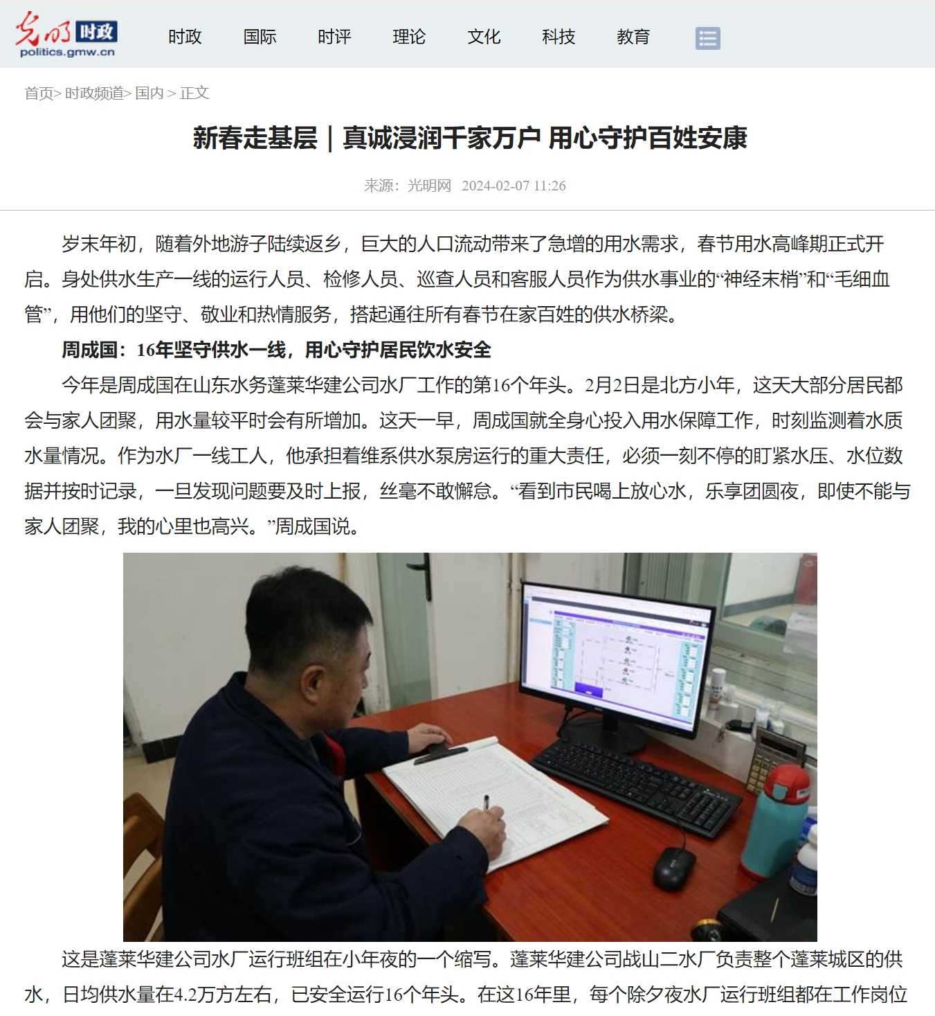 近日,光明網(wǎng)報(bào)道中國(guó)水務(wù)供水生產(chǎn)一線的運(yùn)行人員、檢修人員和客服人員用他們的堅(jiān)守、敬業(yè)和熱情服務(wù),確保人民群眾度過一個(gè)快樂、祥和的春節(jié)。