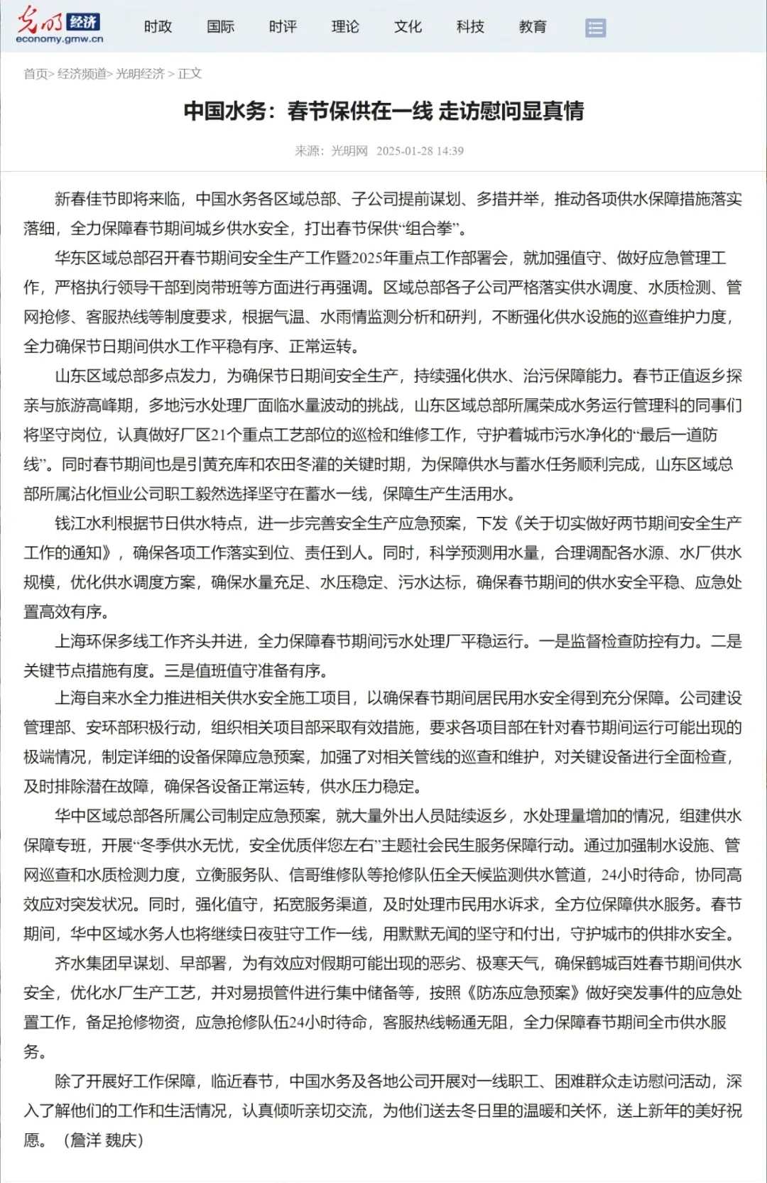 近日,光明網(wǎng)報(bào)道《中國(guó)水務(wù):春節(jié)保供在一線 走訪慰問顯真情》專題新聞,生動(dòng)展現(xiàn)了中國(guó)水務(wù)全力保障春節(jié)期間城鄉(xiāng)供水安全,水務(wù)工作者堅(jiān)守崗位、履職盡責(zé)用實(shí)際行動(dòng)詮釋了新時(shí)代中國(guó)水務(wù)人的責(zé)任和擔(dān)當(dāng)。