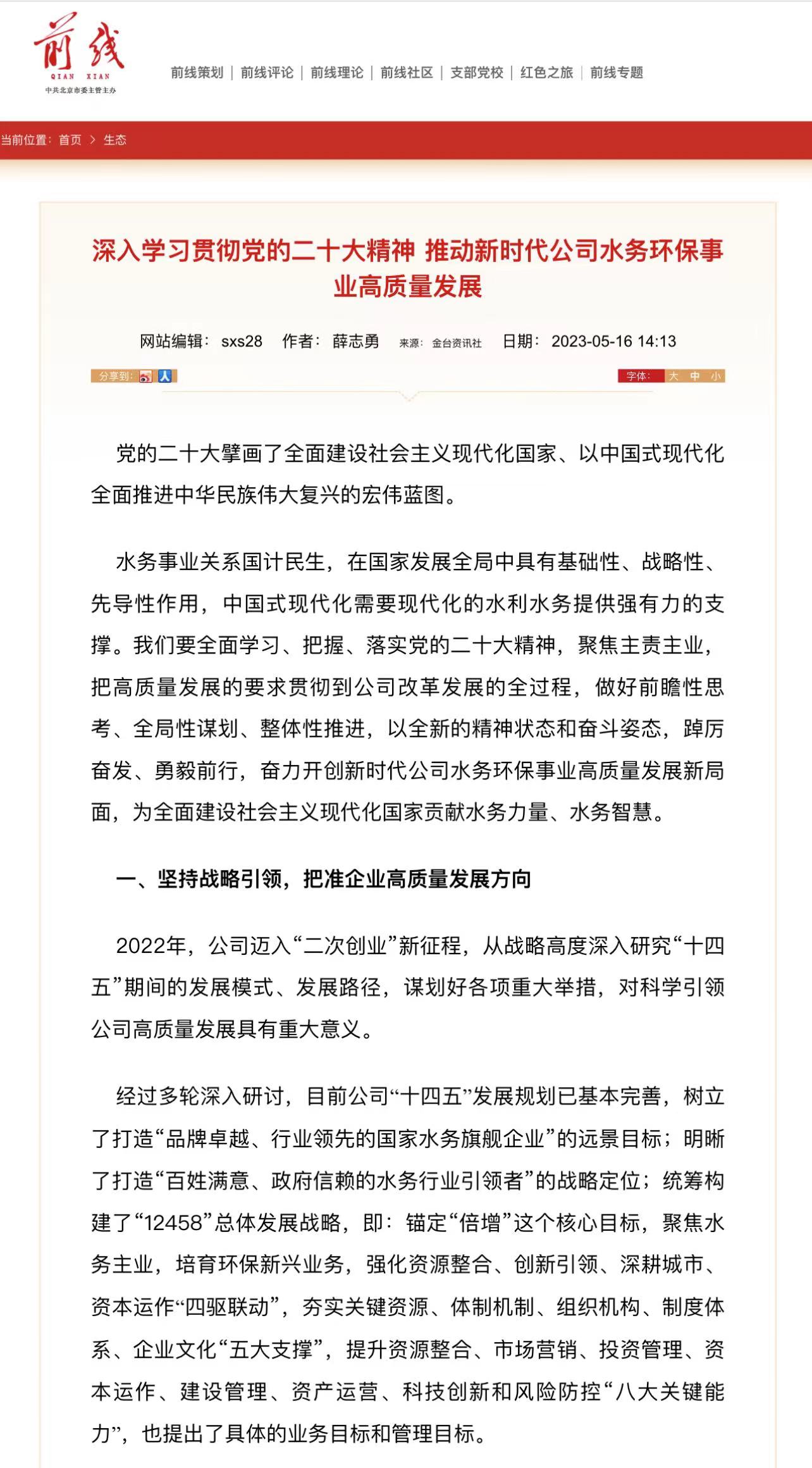 黨的二十大擘畫了全面建設(shè)社會主義現(xiàn)代化國家、以中國式現(xiàn)代化全面推進(jìn)中華民族偉大復(fù)興的宏偉藍(lán)圖。水務(wù)事業(yè)關(guān)系國計民生,在國家發(fā)展全局中具有基礎(chǔ)性、戰(zhàn)略性、先導(dǎo)性作用,中國式現(xiàn)代化需要現(xiàn)代化的水利水務(wù)提供強(qiáng)有力的支撐。我們要全面學(xué)習(xí)、把握、落實黨的二十大精神,聚焦主責(zé)主業(yè),把高質(zhì)量發(fā)展的要求貫徹到公司改革發(fā)展的全過程,做好前瞻性思考、全局性謀劃、整體性推進(jìn),以全新的精神狀態(tài)和奮斗姿態(tài),踔厲奮發(fā)、勇毅前行,奮力開創(chuàng)新時代公司水務(wù)環(huán)保事業(yè)高質(zhì)量發(fā)展新局面,為全面建設(shè)社會主義現(xiàn)代化國家貢獻(xiàn)水務(wù)力量、水務(wù)智慧。