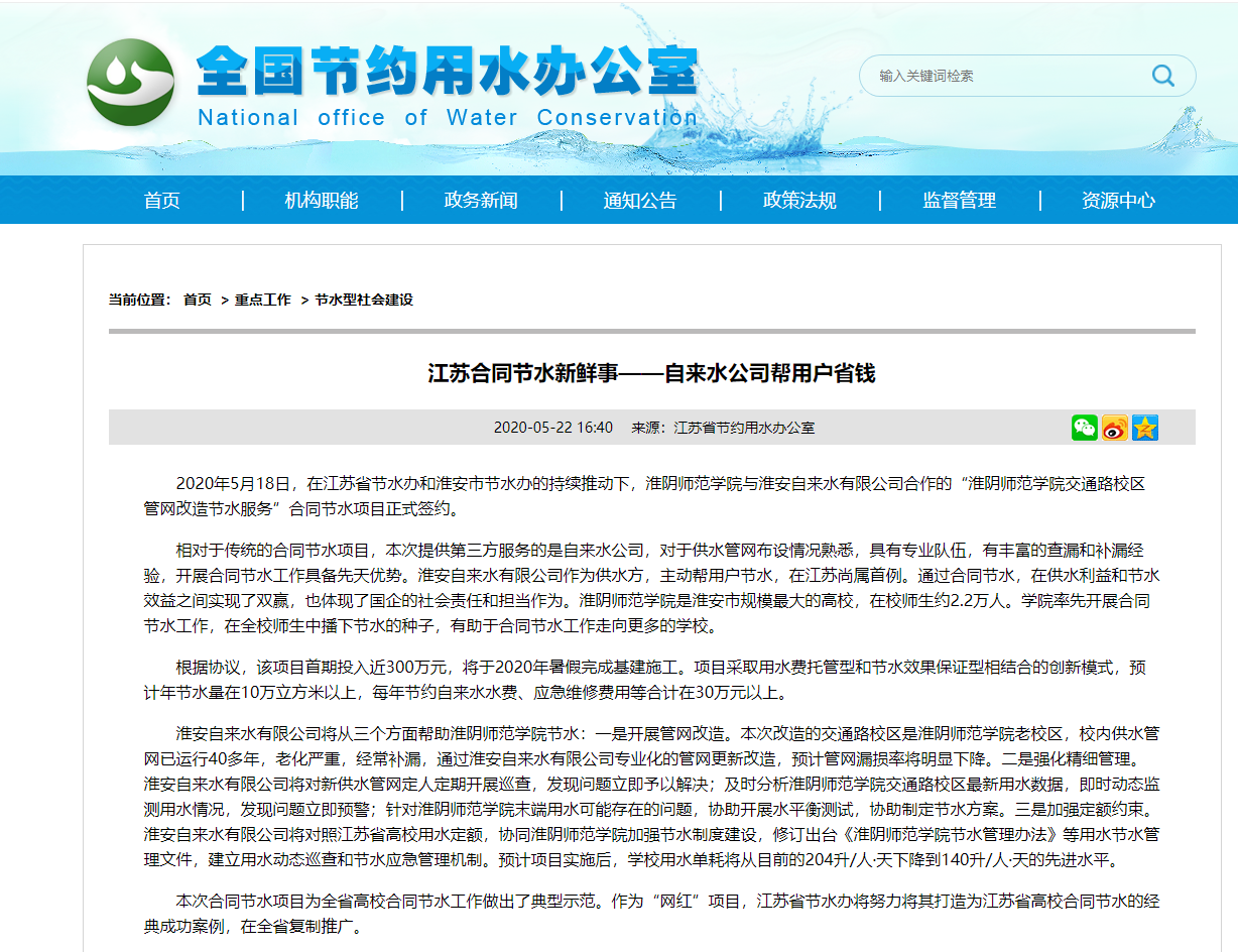中國(guó)水務(wù)高度重視高校合同節(jié)水工作,供水企業(yè)做節(jié)水,體現(xiàn)了企業(yè)在注重經(jīng)濟(jì)效益的同時(shí),更加注重社會(huì)效益的高度政治站位。該項(xiàng)目得到了江蘇省節(jié)水辦、淮安市水利局的大力支持。淮安水司將發(fā)揮技術(shù)優(yōu)勢(shì),努力把該項(xiàng)目建設(shè)成全國(guó)高校合同節(jié)水示范工程、標(biāo)桿項(xiàng)目,并以該項(xiàng)目為契機(jī),努力成為江蘇省合同節(jié)水市場(chǎng)的主力軍,為建設(shè)環(huán)境友好型和資源節(jié)約型社會(huì)做出應(yīng)有的貢獻(xiàn),并為《高校合同節(jié)水項(xiàng)目實(shí)施導(dǎo)則》標(biāo)準(zhǔn)的完善積累豐富經(jīng)驗(yàn)。