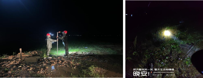 晚上19:00,暴雨再次侵襲岳陽縣,新墻河水無限接近河堤,八仙橋開挖筑堤,岳陽公司3臺工具車奔赴現(xiàn)場,在暴雨的洗禮下,岳陽公司的供水人義無反顧地堅(jiān)守在大堤上,為河堤邊的供水管線做標(biāo)識,防止損壞和搶修辨識。他們深知,自己的職責(zé)不僅僅是保障縣城及周邊鄉(xiāng)鎮(zhèn)的正常供水,更是守護(hù)人民群眾生命財(cái)產(chǎn)安全的重要一環(huán)。因此,他們冒著風(fēng)雨,穿梭在泥濘的河堤、溝渠和路邊,晝夜不停地巡線檢查,確保供水設(shè)施正常運(yùn)行。