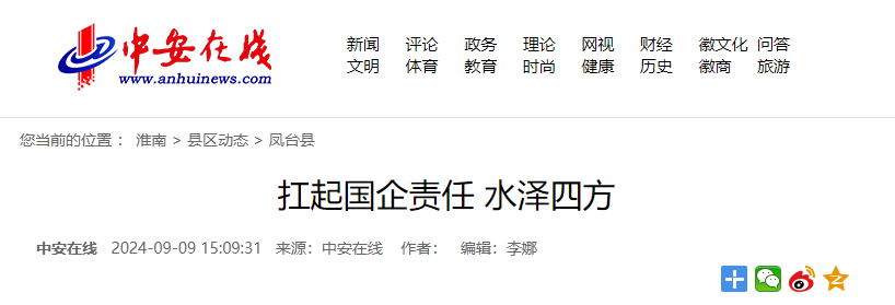 近日,安徽省省直重點新聞媒體中安在線以《扛起國企責任,水澤四方》為題,對鳳臺華水水務有限責任公司夏季保供情況進行報道。