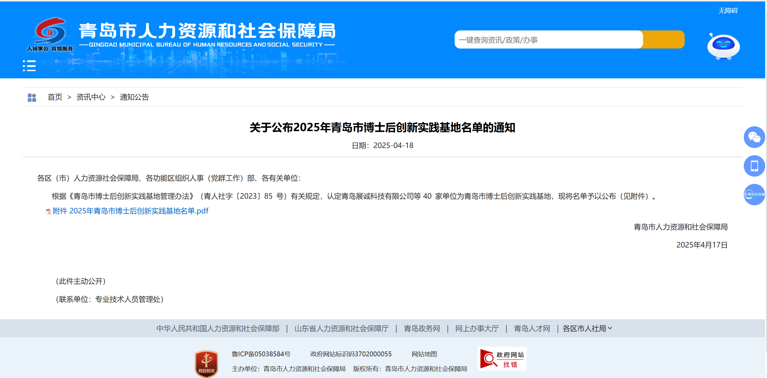 近日,山東區(qū)域總部所屬青島水務獲評青島市人力資源和社會保障局“青島市博士后創(chuàng)新實踐基地”,成為中國水務系統(tǒng)內首家獲評相關資質單位。